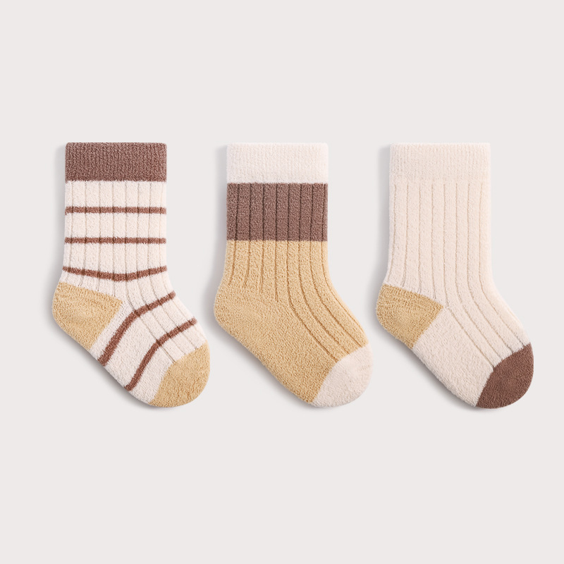【SB173】童襪|日系黃咖條紋珊瑚絨加厚中筒襪(3雙1組)